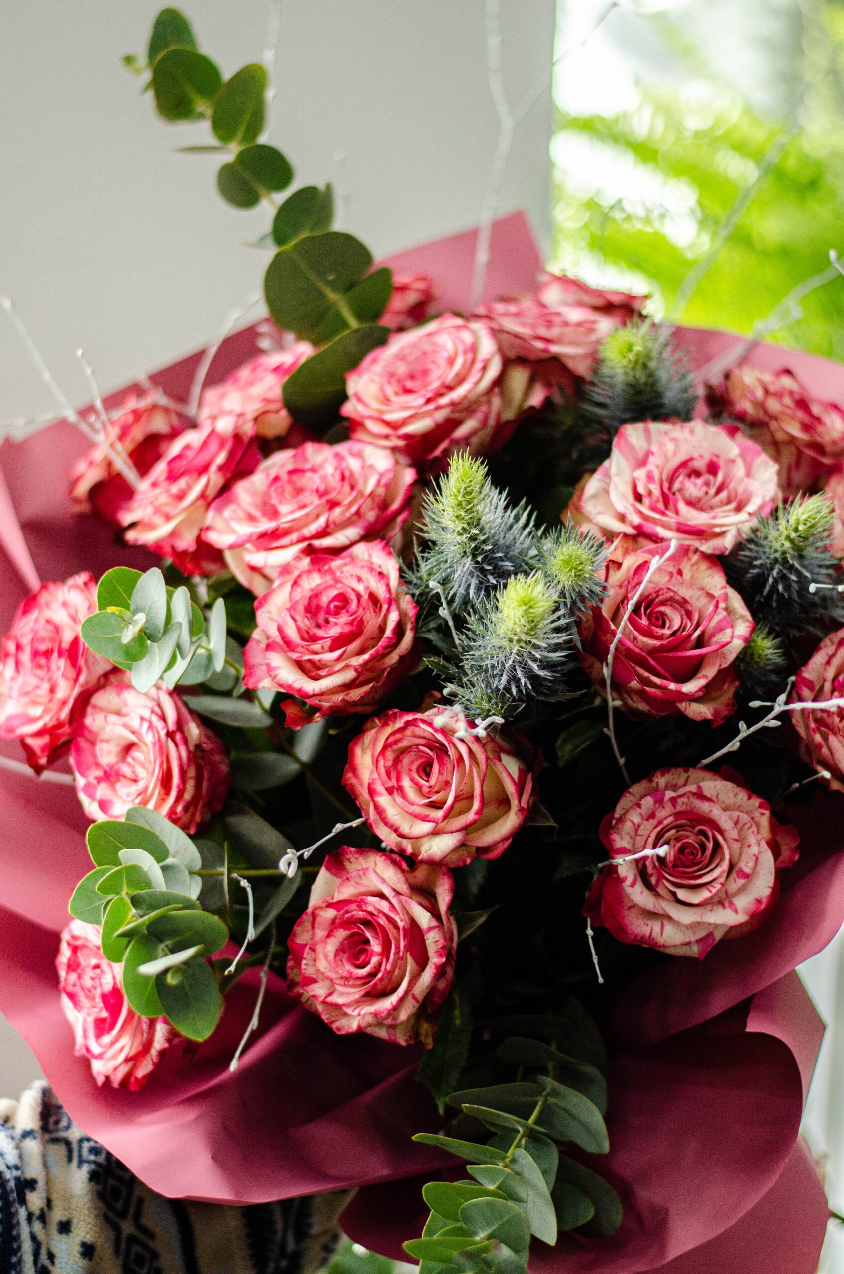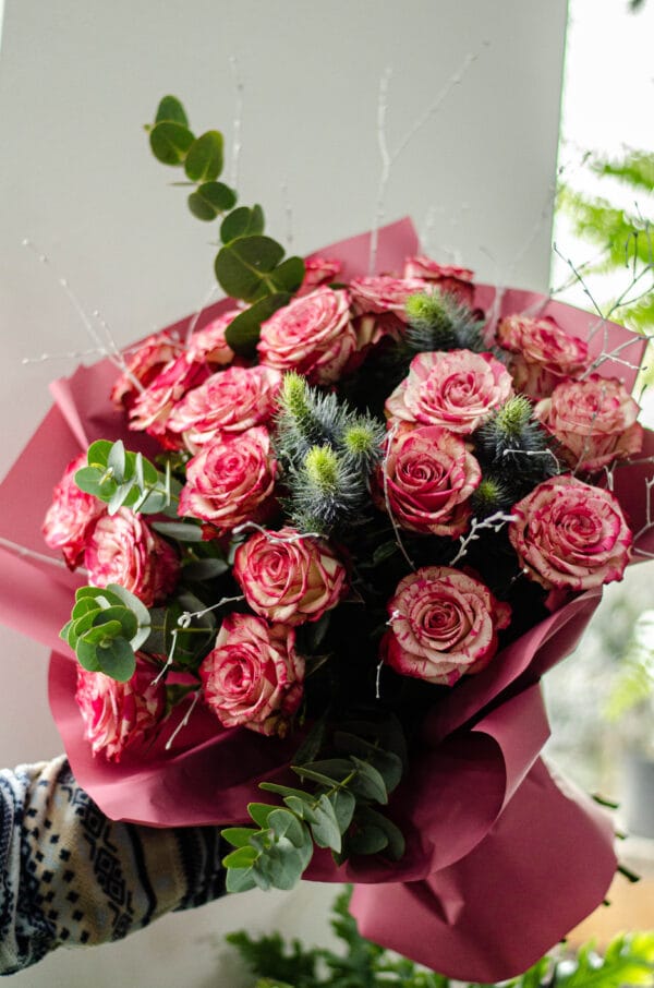 Bukiet składa się z róż, eukaliptusa i niebieskiego mikołajka. Zapakowany w folię florystyczną.