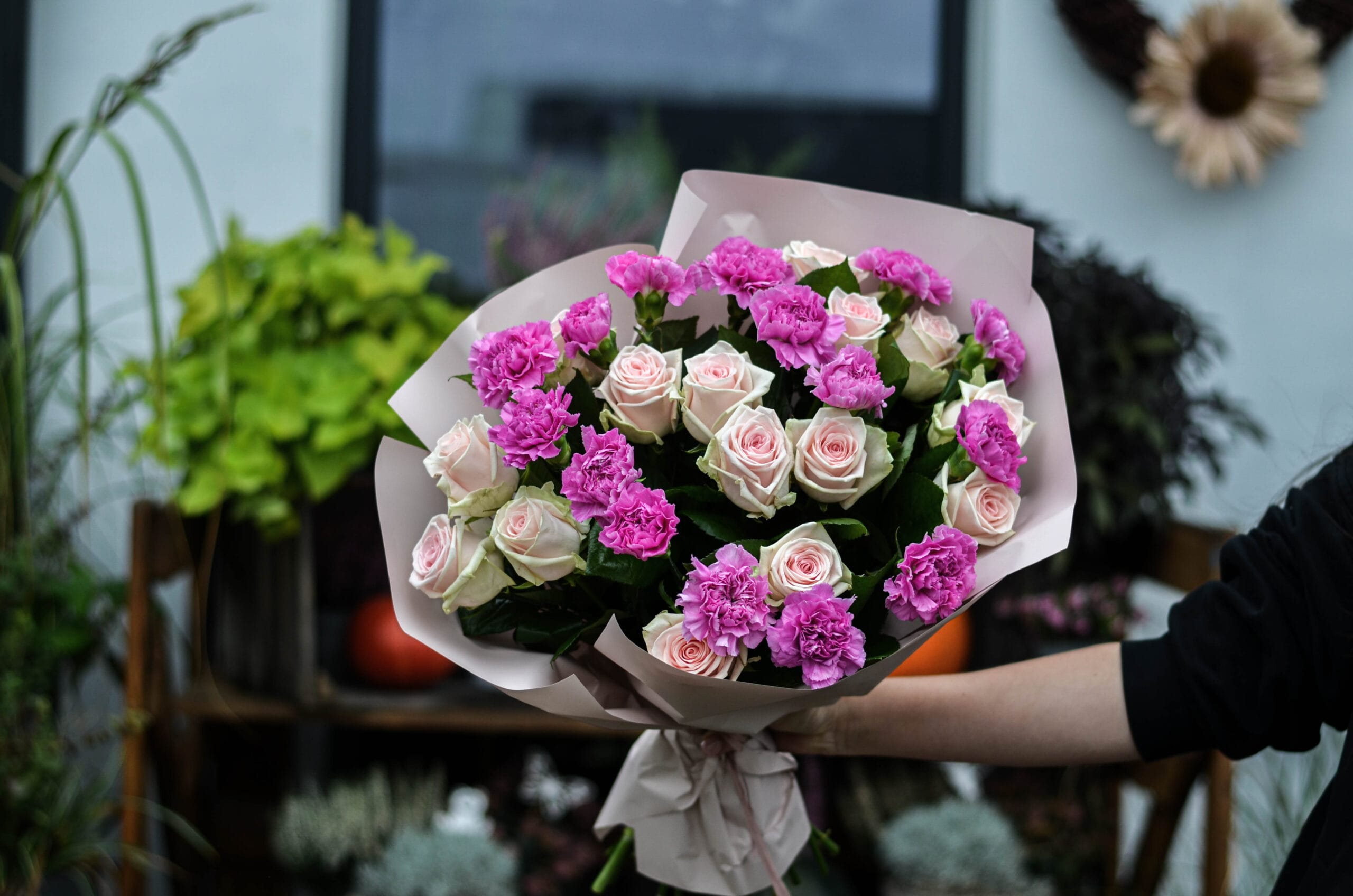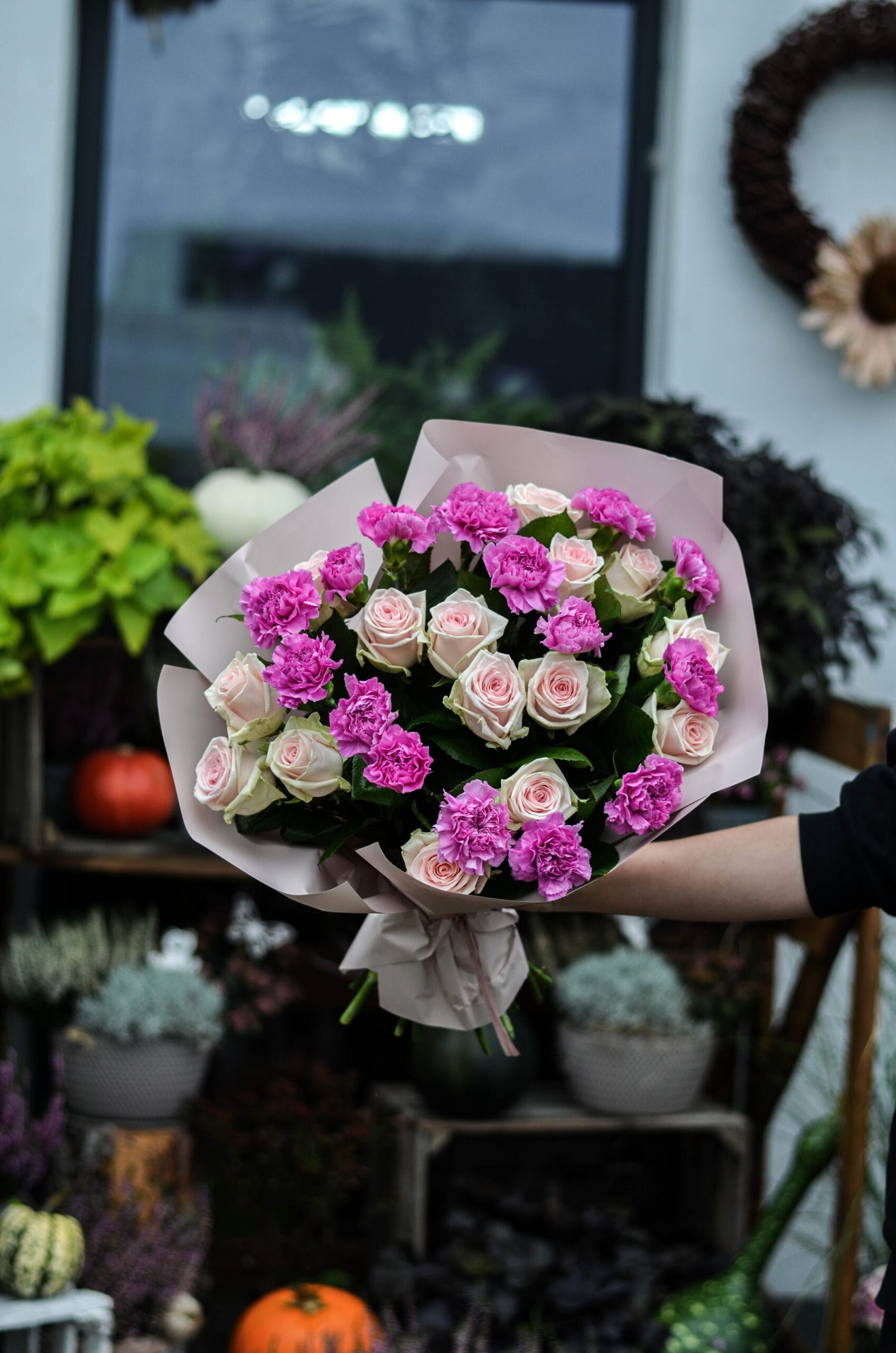 Bukiet składa się z róż, i goździków. Zapakowany w folię florystyczną.