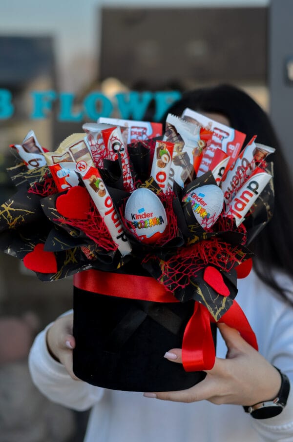 Efektowny box słodkości wypełniony kultowymi czekoladami Kinder (Bueno, Chocolate, jajka Niespodzianka) oraz innymi pysznymi słodkościami. Idealny prezent na każdą okazję – zachwyca wyglądem i smakiem.