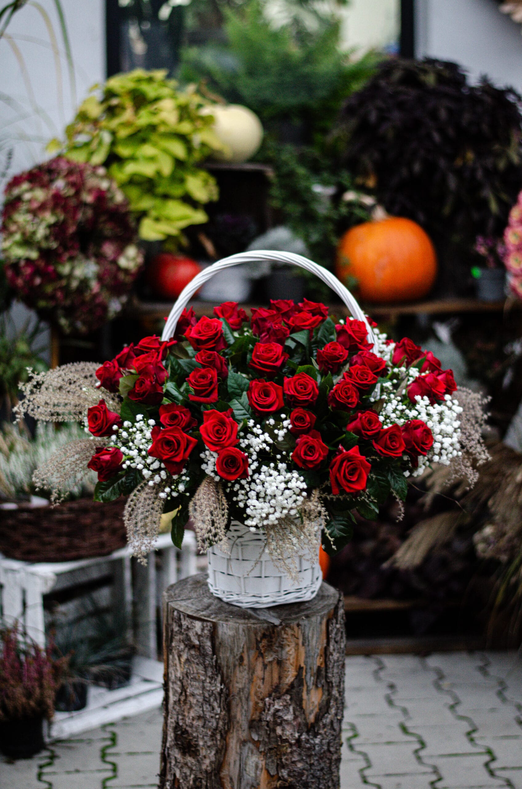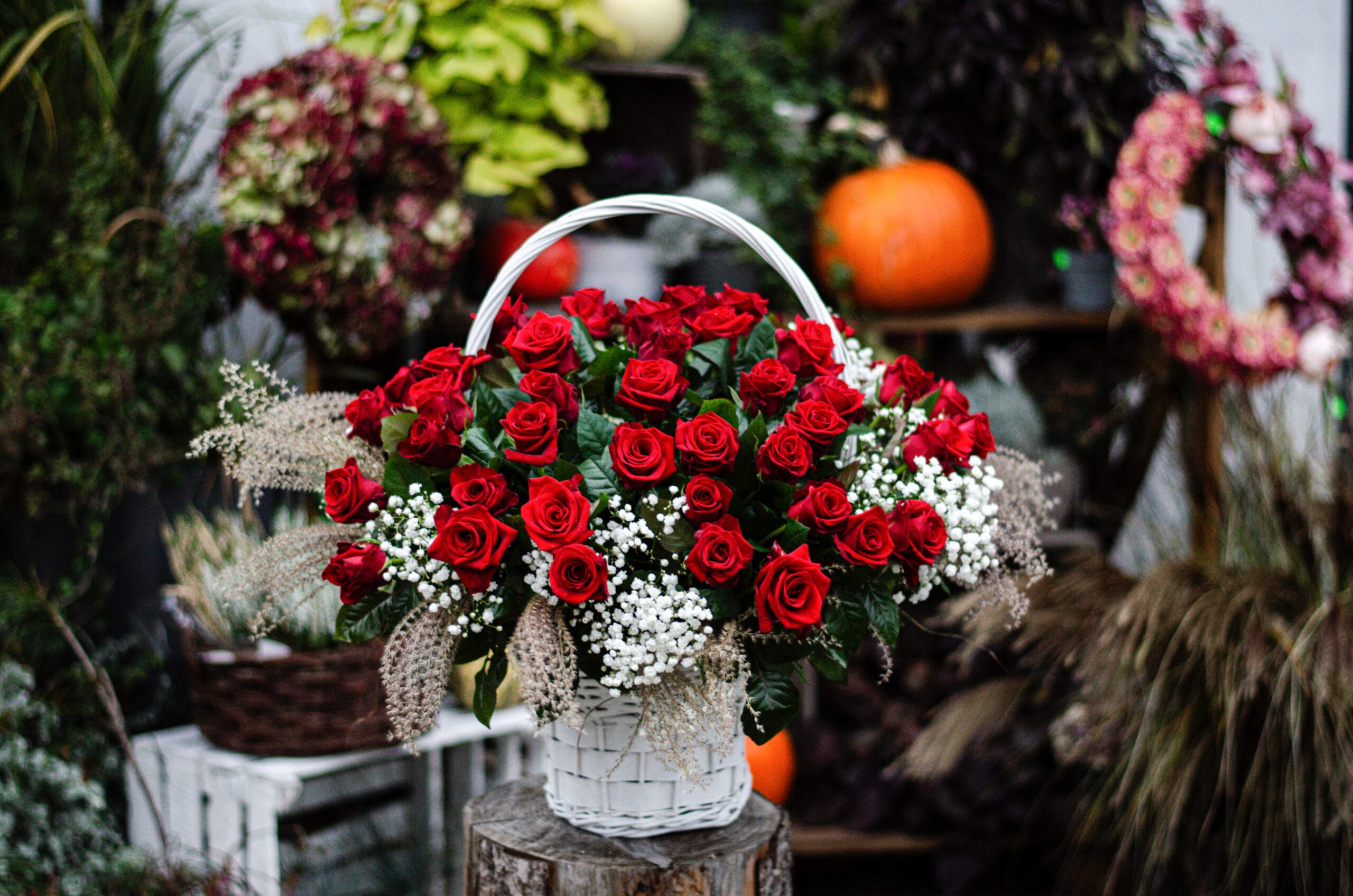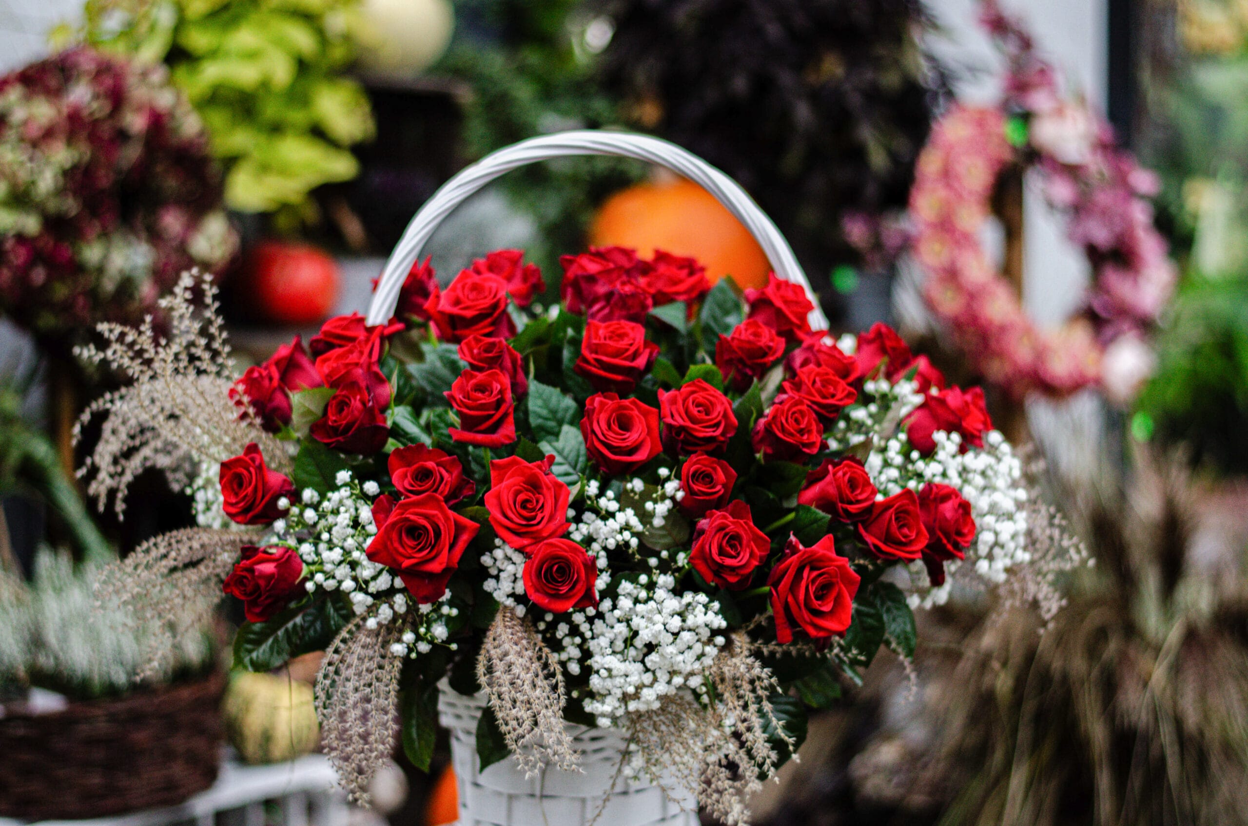Elegancki kosz z czerwonych róż oraz gipsówki – symbol miłości, pasji i ponadczasowej elegancji. Starannie ułożone kwiaty tworzą efektowną kompozycję, idealną na wyjątkowe okazje.